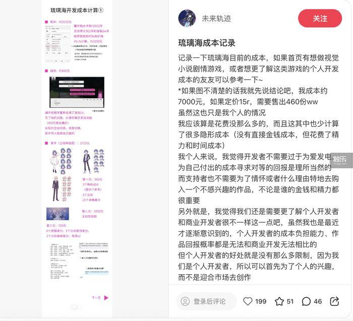 新帖子的内容非常详细。未来轨迹试图说明《瓶中琉璃海》的定价原因。除了外包和插图定制的开销,她将自己付出的劳动——撰写7万多字的游戏剧本——用3150元记入了成本中,游戏的成本总计约为7000元。