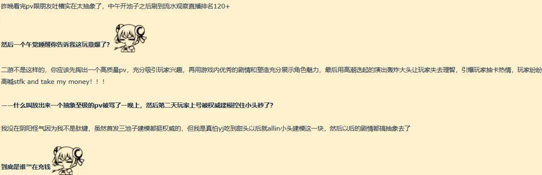 “你应该先掏出一个高质量pv,充分吸引玩家兴趣,再用游戏内优秀的剧情和塑造充分展示角色魅力,最后用高潮迭起的演出轰炸大头让玩家失去理智,引爆玩家抽卡热情,玩家纷纷高喊stfk and take my money!!!”(引自玩家评论)