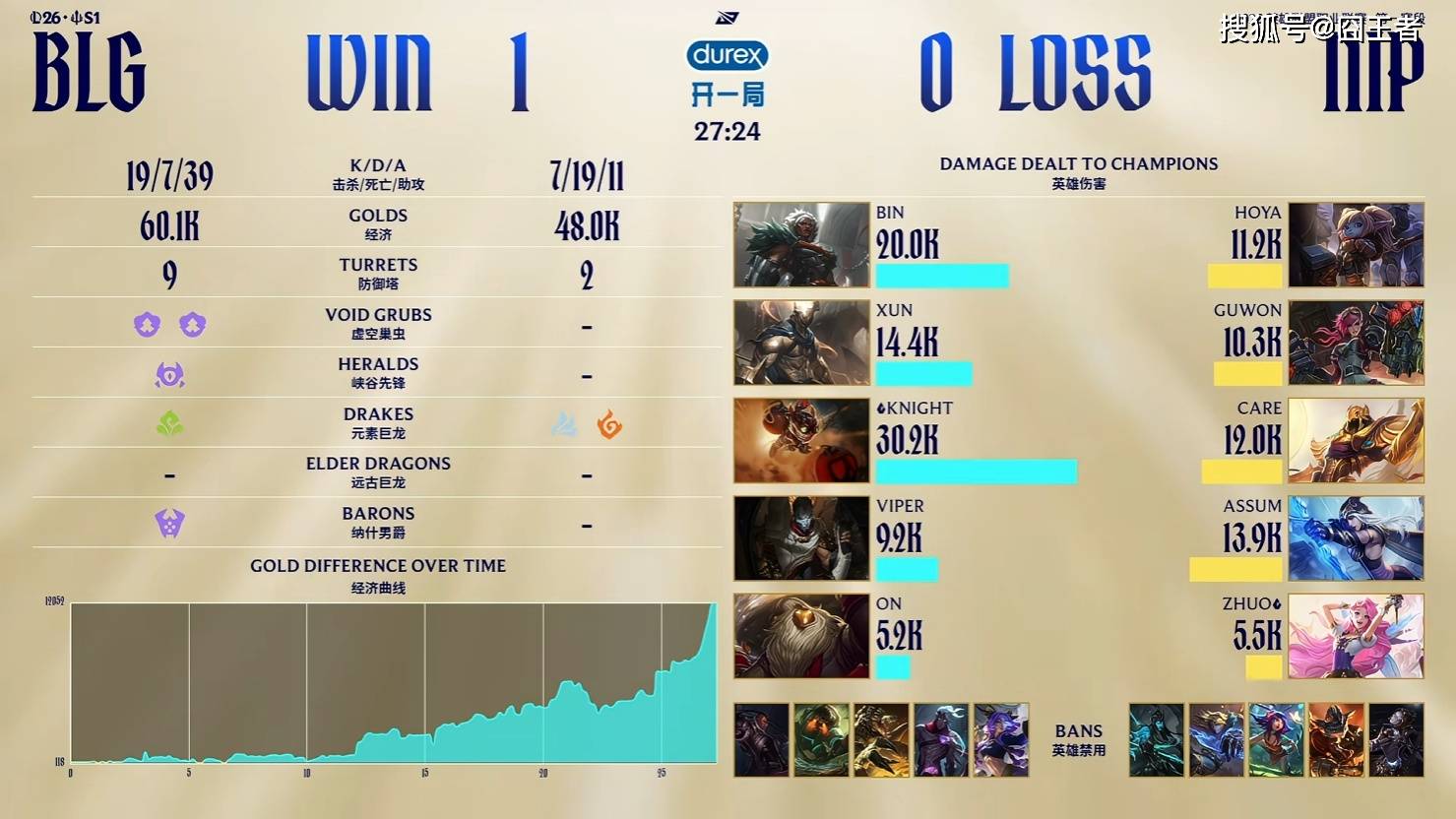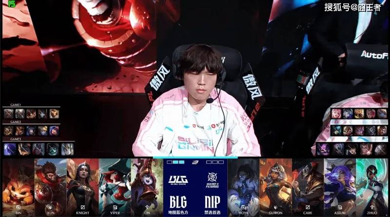 第一局比赛,BLG蓝色方,禁用:芸阿娜;韦鲁斯;鳄鱼;泰坦;卢锡安,选用:Bin狼母;Xun潘森;Knight炸弹人;Viper烬;ON巴德;NIP红色方,禁用:发条;兰博;妮蔻;伊泽瑞尔;卡莉斯塔,选用:HOYA波比;Guwon蔚;Care沙皇;Assum寒冰;Zhuo萨勒芬妮