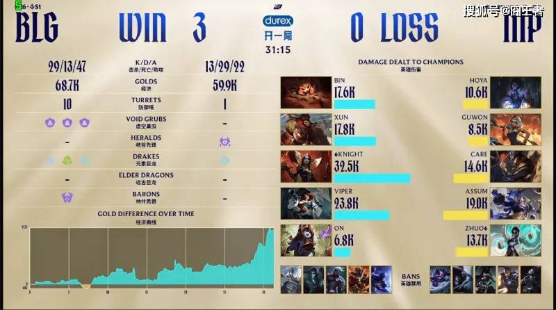 结果第三局比赛,BLG依旧是强势局,32分钟内结束了比赛。1分钟,Knight妖姬一级来上支援,配合Bin直接击杀HOYA塞拉斯;4分钟,双方中野爆发碰撞,Knight妖姬拿下双杀Care卡牌换掉妖姬;6分钟,满血就是斩杀线,HOYA塞拉斯一套连招瞬间秒杀Bin纳尔;13分钟,Assum芸阿娜突然发威,豪取三杀收割团战;16分钟,还以颜色,Bin大纳尔主动出击一套丝滑连招完成单杀;19分钟,ON关键变羊限制Assum,Xun猴子战斗力拉满BLG完成2换4;21分钟,NIP双C配合瞬间击杀Viper,NIP顺势拿下小龙;最终31分15秒,Knight和Zhuo互亮TES标,结束比赛。
