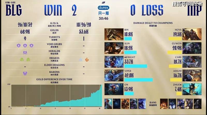 结果第一局比赛,完全就是BLG的单方面碾压局。3分钟,双方打野支援中路,Xun潘森击败阿兹尔拿下一血,双方打出一换一;24分钟,Viper烬技能精准击败蔚,Bin安蓓萨击败艾希,BLG完成零换三,顺势拿下大龙;26分钟,BLG越塔进攻NIP,Knight吉格斯击败蔚团灭NIP,BLG顺势推平基地拿下胜利。