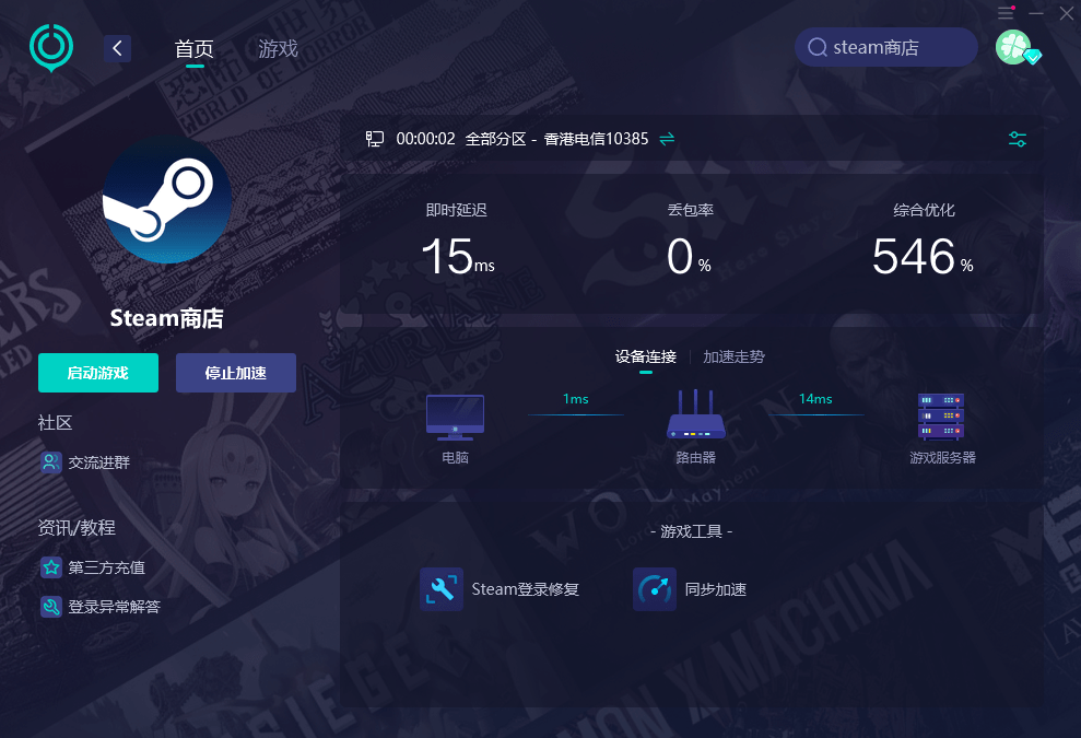 (1)在UU中搜索《steam商店》,选择对应的平台与服-务器进行加-速