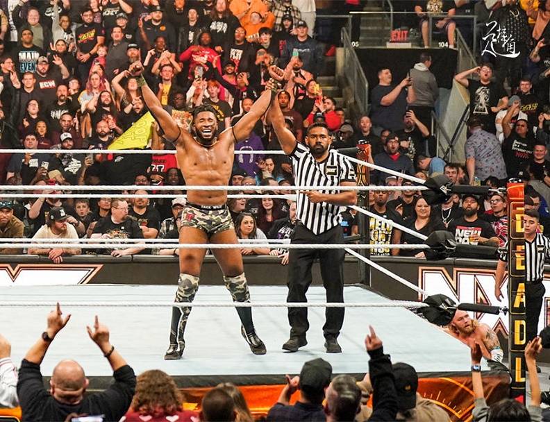 是的,你没有理解错,他就是在最后几十秒完成绝地反击的,先后4次被关进场边单间的特里克,最后也力挽狂澜般地先后将4名对手挨个儿压制了一遍,哪怕是刚上场时连续凭借三个飞冲肩,不费吹灰之力拿下3分的布朗 布雷克,同样在试图对特里克祭出飞冲肩之际遭到反杀,红光映照下一个不偏不倚的飞膝,让特里克如愿获得NXT冠军挑战权!