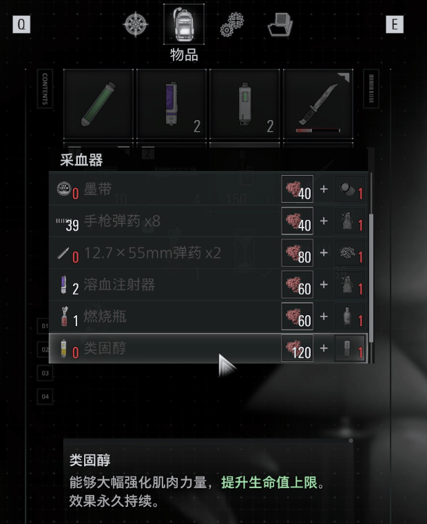 简单来说,“变异血液”是一种合成道具的通用货币。它既是与“零件”合成子弹的“火药”,也是与“绿草”合成医疗注射器的“红草”,它还能合成存档道具“墨带”、潜行杀敌的“溶血注射器”,以及永久提升格蕾丝性能的成长道具“类固醇”和“稳定剂”。可以说,游戏中大部分道具的合成,都离不开变异血液。所以,用采血器收集“变异血液”,便是资源能否保持续航的关键。