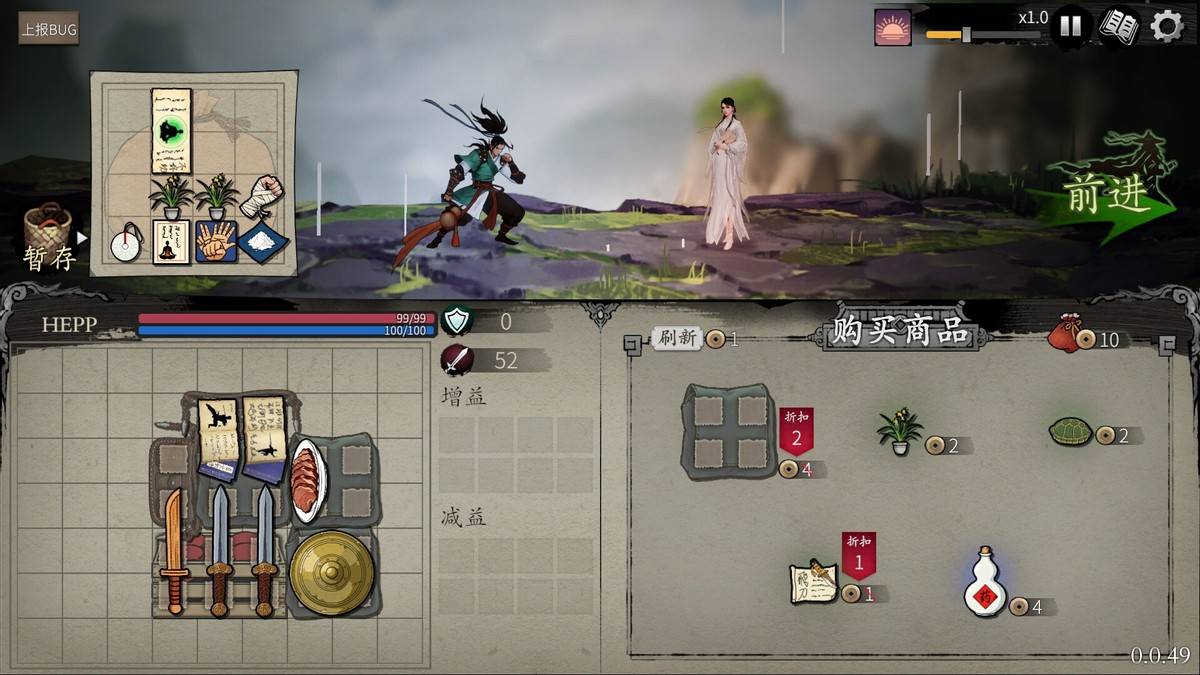 游戏玩法:《背包闯江湖》是一款背包管理策略玩法的武侠吃鸡游戏。在每局游戏中,可从多个初始门派选择其一进入江湖,与其他99名异步匹配的玩家同台竞技。
