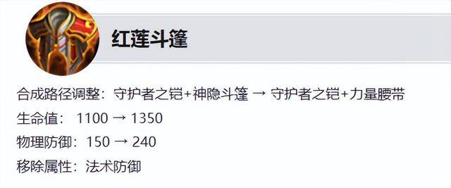 红莲斗篷加强:合成路径优化,移除法术防御,物理防御增加90点,生命值增加250点。