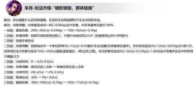 芈月加强:被动和1技能的前期伤害降低,2技能新增锁链可最多链接五个目标,且链接目标越多回血越多,并对目标造成持续减速。2技能的CD减少2.5~4秒,且结束后才进入冷却。3技能的CD增加1~0秒,3技能的前期移速降低,3技能的伤害降低。
