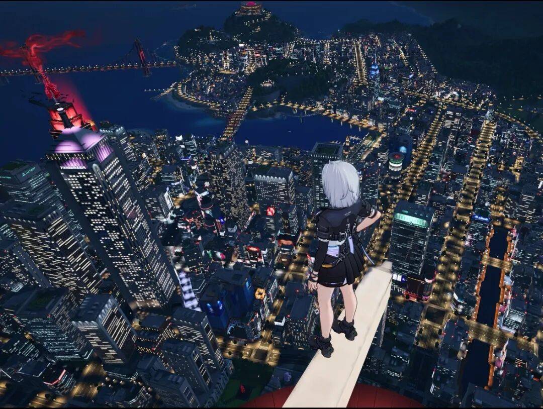 进入游戏,你很容易感受到大都市的前卫与繁华。不同于强调高度拟真的都市游戏往往过于“现实”,异环中的景观“出片感”很强,几乎随便找个楼站上去,就能拍出宣传海报的效果。