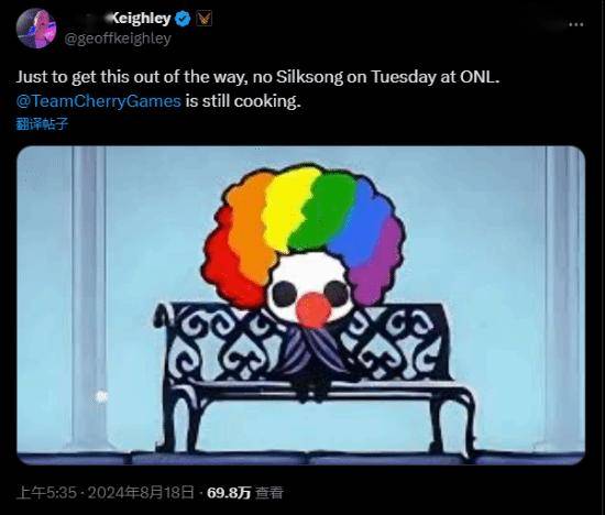 科隆游戏展“开幕之夜”直播将于8月20日开始,其主持人Geoff Keighley一直在利用社交媒体为直播造势,公布一些本届科隆展中会出现的游戏名单。近日,他在推特中表示,《空洞骑士:丝之歌》确认不会出现在本月的科隆电玩展中。