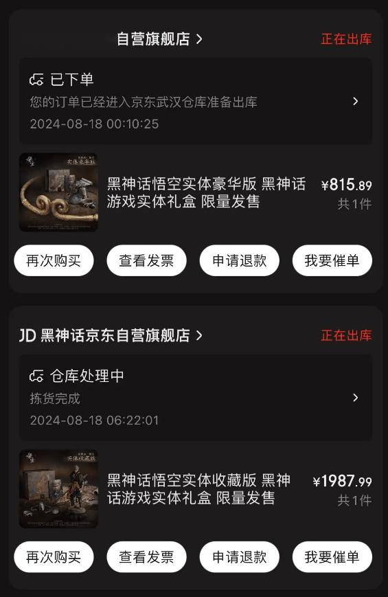 据购买《黑神话:悟空》实体版的玩家反馈,首批实体版已经于今天凌晨陆续开始发货,部分玩家可在8月20日游戏解锁前收到货。