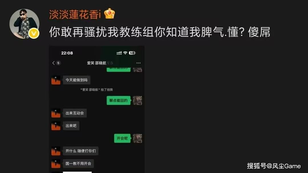 JDG经理连莲花,赛后晒出了AL经理爱笑,和自家分析师的聊天记录,并且配文:敢再骚扰我教练组,你知道我脾气,傻D,聊天记录里的内容很有意思,爱笑问京东分析师:今天能做到吗?分析师回应正在开会,爱笑表示:开什么,随便打你们,国一教(指的是Tabe教练)不用开会。