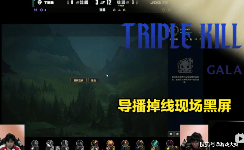 LPL再次出现严重技术问题,比赛转播突然黑屏,正在解说的人都愣住了,在JDG与TES的第二局比赛中,原本节奏渐起,小规模团战一触即发,结果在19分34秒这一关键时间点,画面突然黑屏并退出客户端,整整5秒,观众只能听到解说声音,却看不到任何画面。
