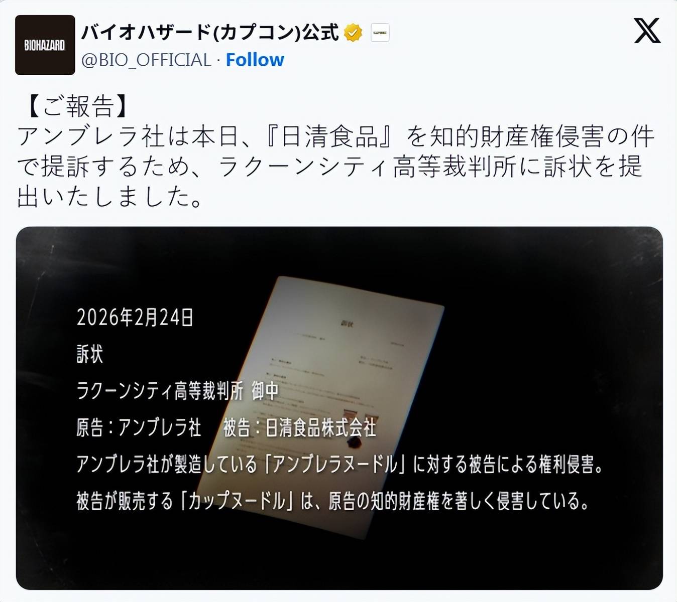 《生化危机9》火热发售中,近日,卡普空日本官推发布了一条离奇的“新闻”:游戏中的安布雷拉(保护伞)公司对日清食品提起了一项虚构的侵权诉讼,因为日清集团出品的杯面与游戏中的彩蛋“安布雷拉面”(Umbrella Noodles)极其相似,这份诉状已提交至“浣熊市高等法院”。