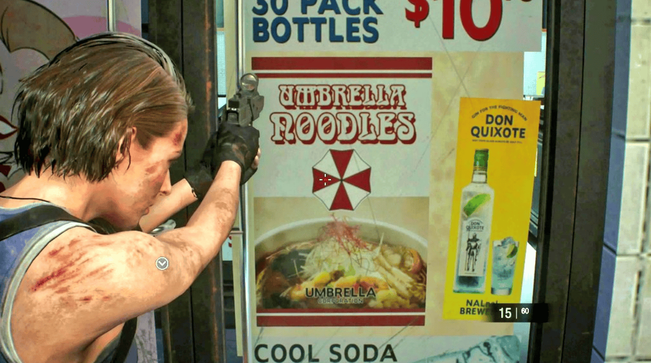 “安布雷拉面”是生化系列的老梗,因为安布雷拉的公司标志致敬了现实世界里的“杯面”,不仅模仿其标志的红白配色,连字体也如出一辙。此彩蛋最早被发现于《生化危机:爆发》,此后多次出现,最近一次是在2020年《生化危机3》重制版,出现在浣熊市街头的广告。
