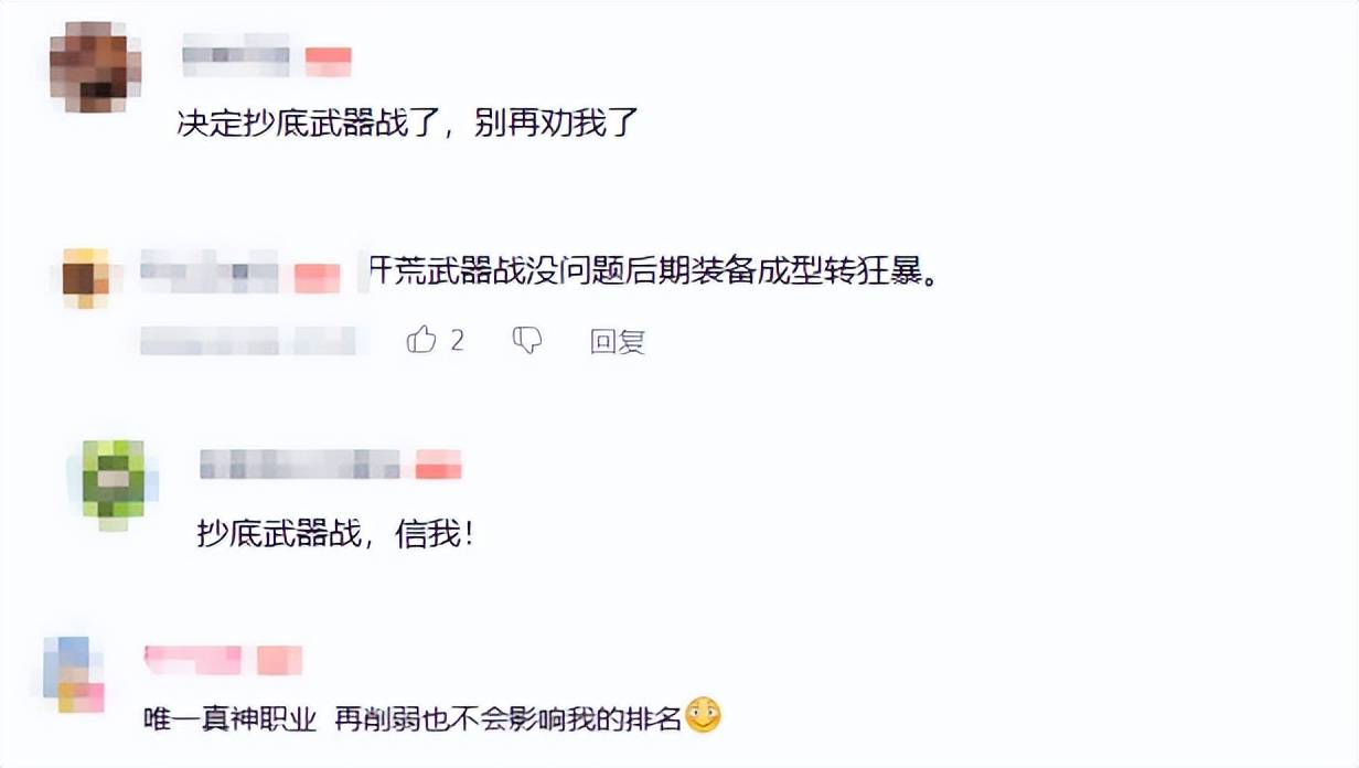 当然,也有不信邪的朋友,他们不忘初心,坚持到底:“梭哈抄底武器战”、“懂了,梭哈玩武器战”、“唯一真神职业,再削弱也不会影响我的排名”、“抄底武器战,信我!”。说实话,战士到时能不能进本还真是个问题。