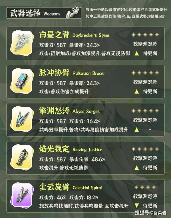 4、陆·赫斯武器首选专武白昼之脊。其次新常驻五星也是非常适配陆·赫斯,如果资源紧张可以先用着。老常驻五星和赞妮专武同样可以提供部分普攻收益。其余五星专武暂不推荐。四星武器的话可以考虑尘云旋臂。