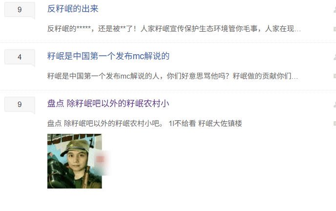 在那段时间,百度有专门的“反籽岷吧”“反籽岷帝国吧”,就连连籽岷自己的贴吧也像“王泪吧”那样被恶俗人士占据,各种大头照、生活照传遍全网,其中绝大部分恶搞P图的恶毒程度远在前面的“镜像图”之上——例如在籽岷的生活照上P上日本军装,无端造谣对方为“大佐”之类,不一而足。