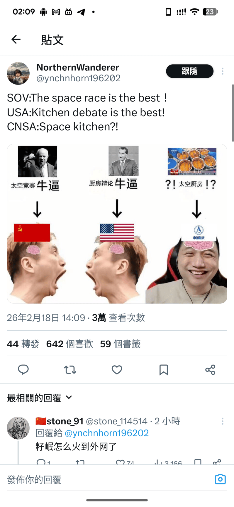 甚至到了外网,你都能看到打出了国际影响力的“逼逼”以太空竞赛VS厨房辩论VS太空厨房的形式出现,足以见得优秀的互联网梗没有文化壁垒,大千世界搞起抽象都一个样……