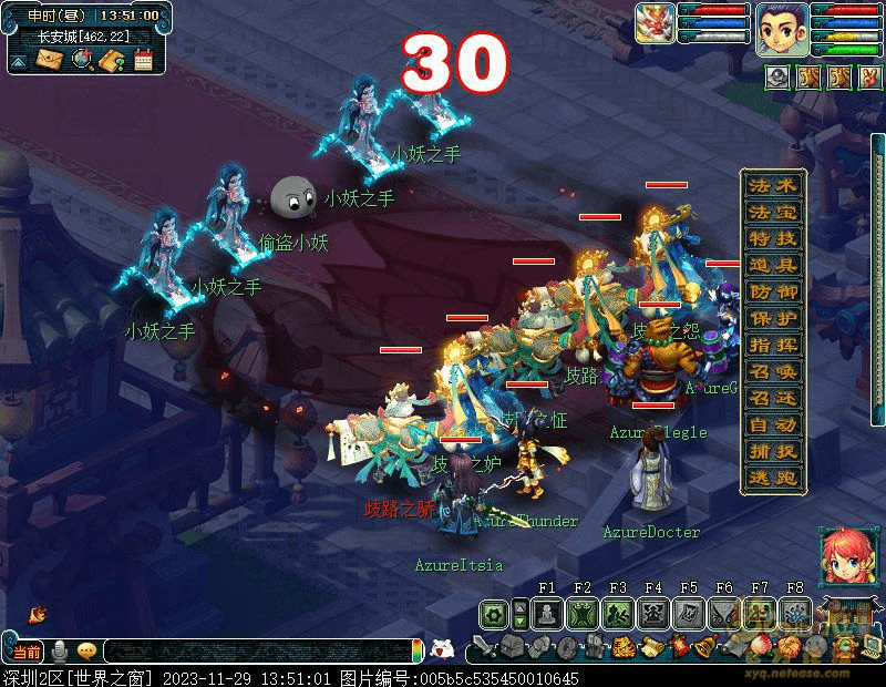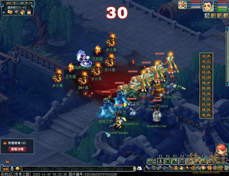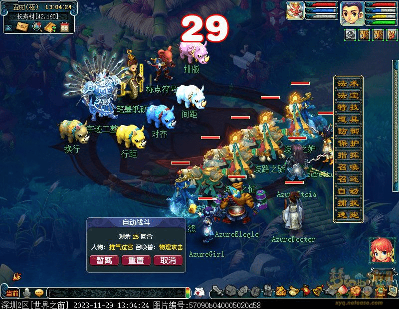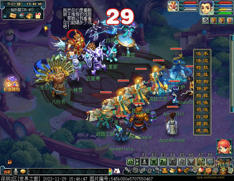 9.找癫散班主(建邺城60,113)传送到芙蓉园接受礼部尚书(仙乐筵32,41)的考核,需战斗四灵印破碎,前排依次为:狮驼 狮驼 地府 大唐 化生, 可优先封印狮驼点杀四灵印,挨个击杀降低战斗难度。
