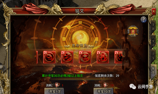 三国封魔传30天开启铭文玩法详解,在闯天关-铭文系统里,玩家可以使用源石抽取铭文,而源石则可以通过打本服和跨服的铭文BOSS爆,或者在活动中直接购买。