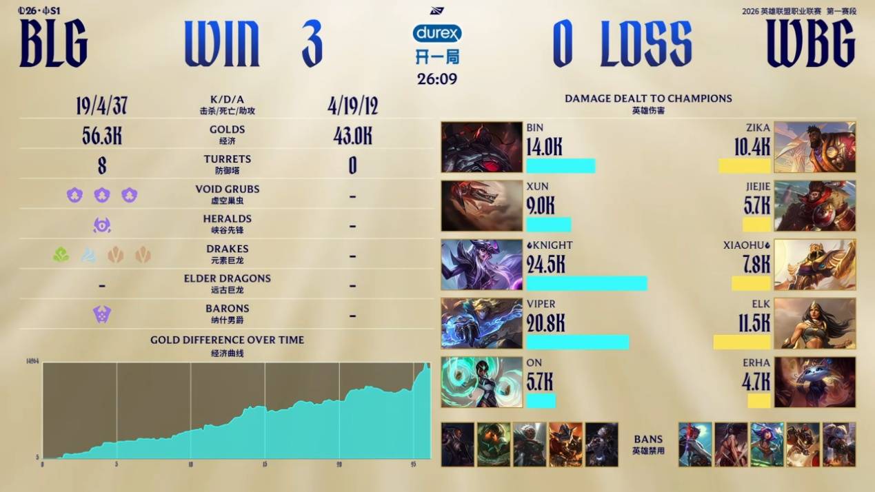 本轮比赛双方对位呈现出巨大差距,即使是比较有来有回的第一局,BLG上中都取得了不错的优势,WBG是靠着Jiejie皇子的连续针对下路打出了一定的前期优势,BLG则选择针对上路拿下人头。