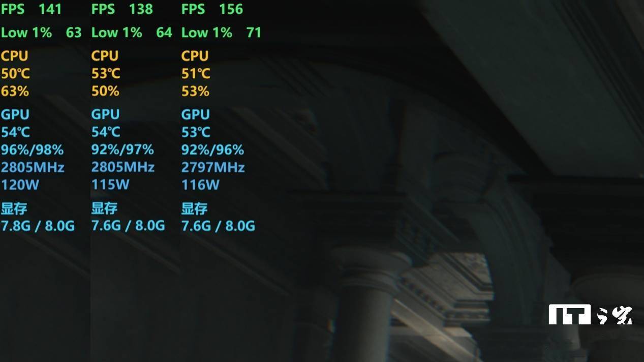 无论是 4K + 路径追踪,还是 1080P + 关闭光追,显存占用都是满载红条状态,而一旦出现“爆显存”情况,就会造成模型材质丢失,效果还不如关闭光追。对于不追求极致画面效果的玩家而言,关闭光线追踪下的画面效果就已经非常不错了。