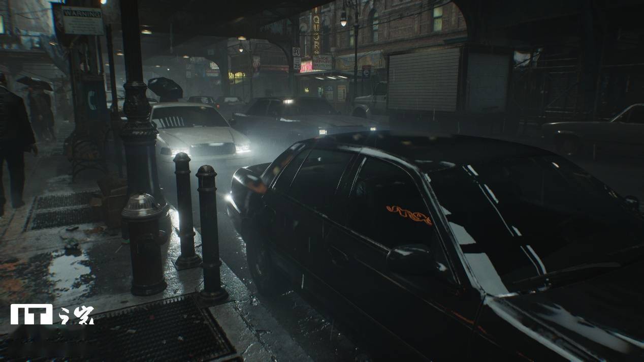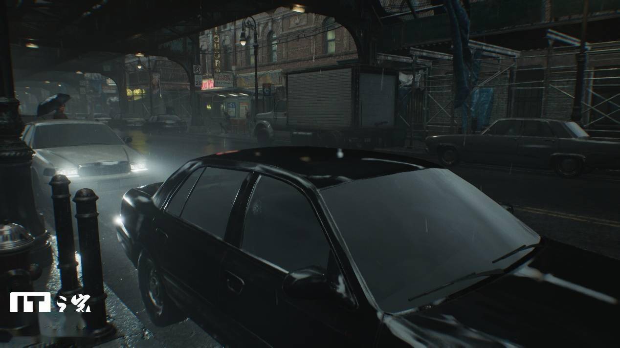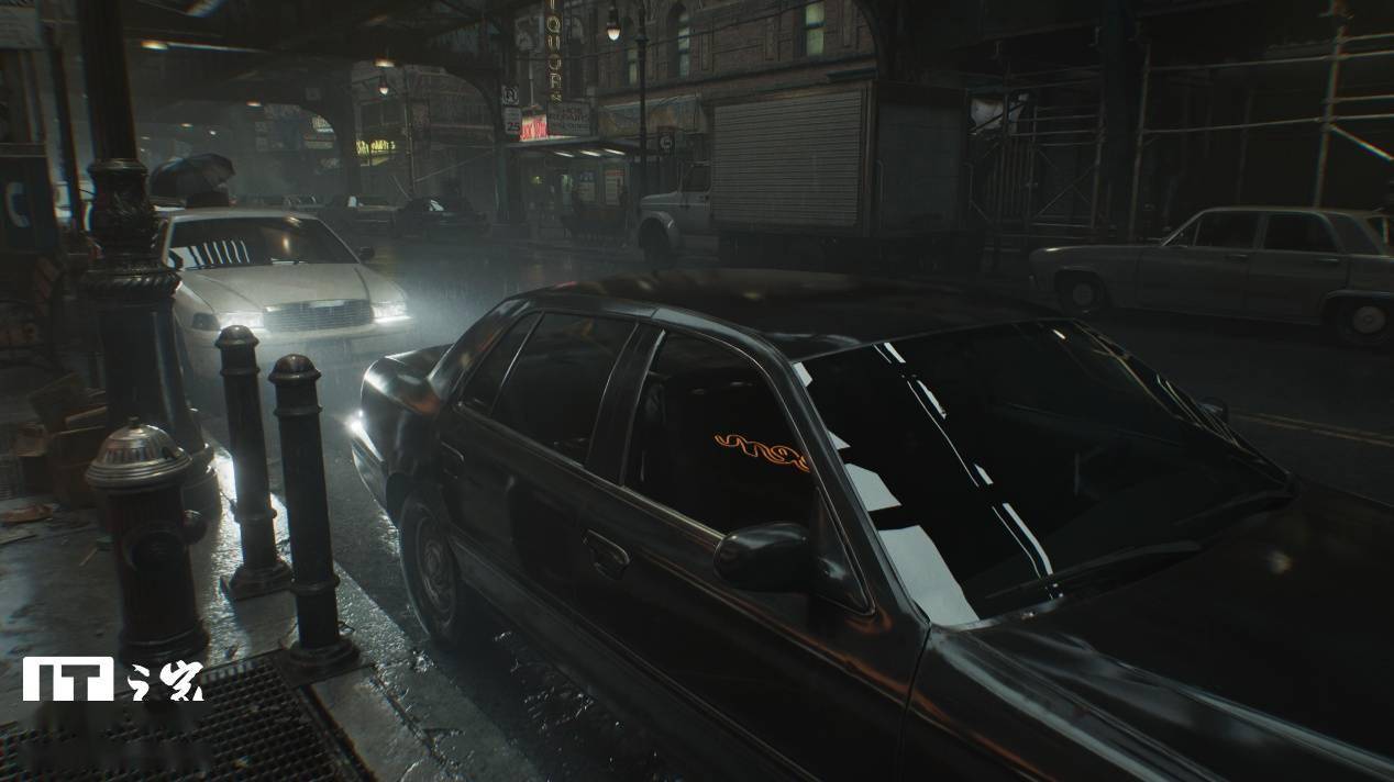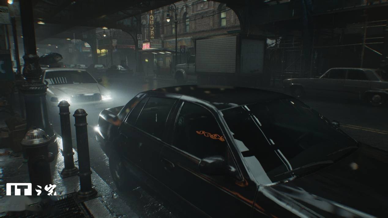 可以看到,关闭和开启光线追踪后画面的区别非常明显,在关闭光线追踪时,场景中主体黑色汽车的对比度偏低,前挡风玻璃的反射非常微弱,侧门玻璃上对于左侧街道上灯箱广告牌的反射直接变成了光带。