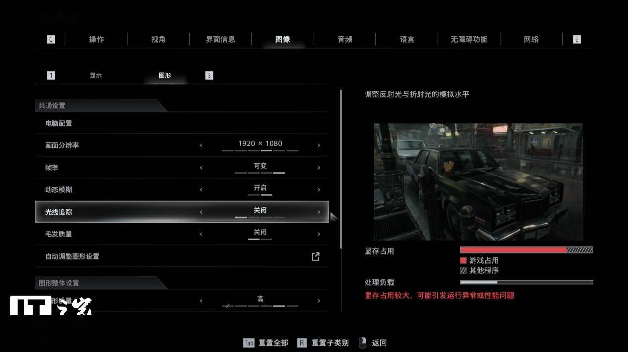 1080P 分辨率 + 关闭光线追踪,游戏显存占用提示