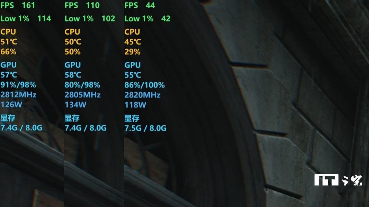 我们先看原生画质下的光栅性能表现。在序章鷦木旅馆外围这里,依次使用 1080P、2K 和 4K 分辨率进行截图,在默认高画质预设下,游戏平均帧数分别为 161 帧、110 帧和 44 帧,1% Low 帧分别为 114 帧、102 帧和 42 帧。
