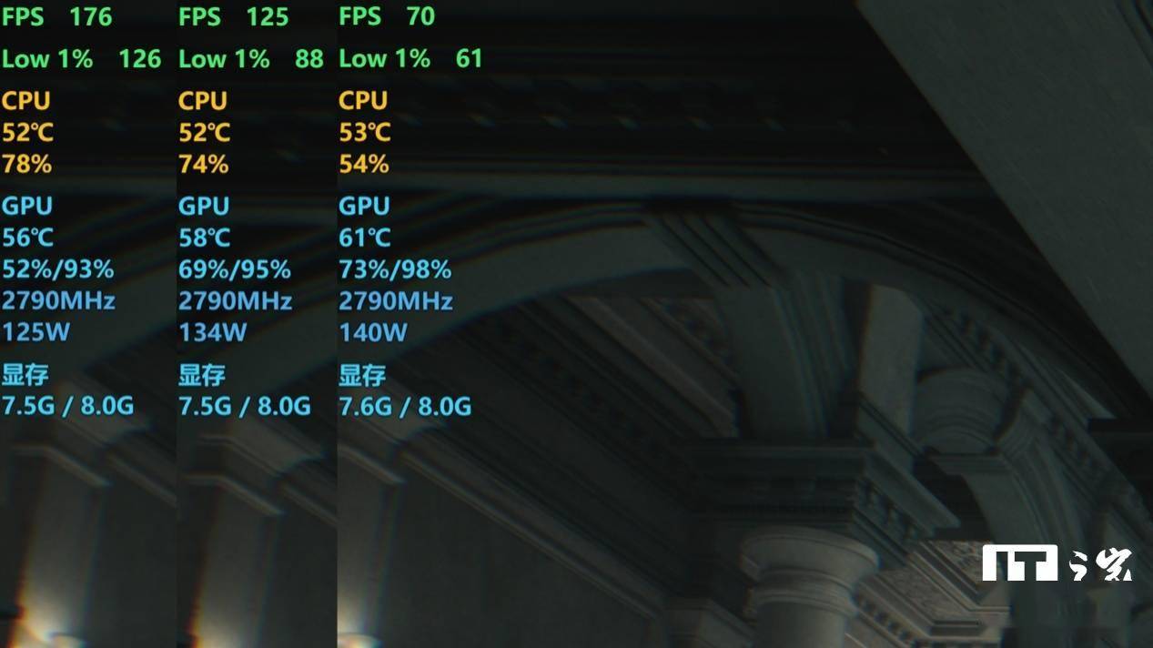 那有小伙伴要问了,如果开光线追踪能玩吗?我们也帮大家试了下,在 1080P 分辨率高画质预设下,开启普通光线追踪档位,游戏平均帧数为 71 帧,DLSS 质量档位,1% Low 帧只有 48 帧。