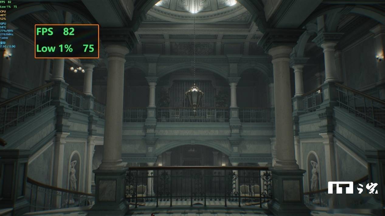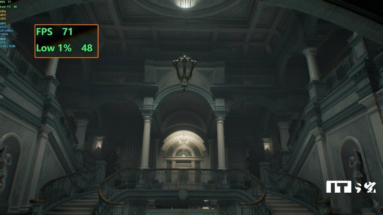 那么室内场景的表现会更好吗?第二组场景我们选择了疗养院中的大厅,主角需要多次回到这里进行一系列小解谜和搜集道具的探索,非常有代表性。同样在默认高画质预设下,1080P、2K 和 4K 分辨率的游戏平均帧数分别为 161 帧、105 帧和 53 帧,1% Low 帧分别为 139 帧、73 帧和 47 帧。