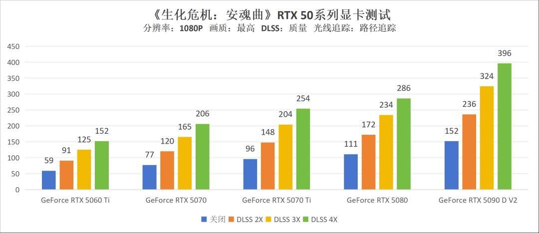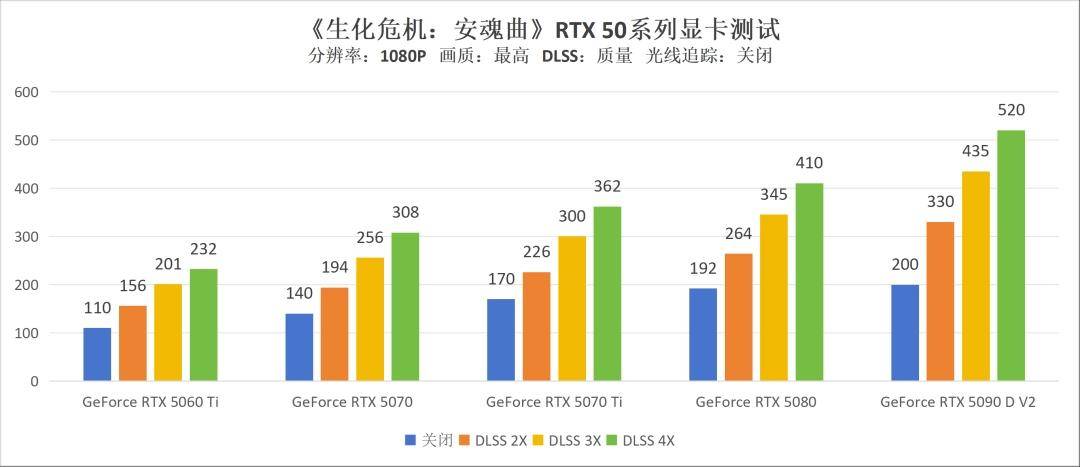 首先是比较轻松的1080P分辨率表现。可以看到,在不开启光线追踪的前提下,所有显卡在关闭帧生成时,均能稳定跑到100帧以上,表现属实惊人。开启4倍DLSS帧生成后,只需一张GeForce RTX 5070,游戏帧数就能轻松突破300大关,并且操作时不会感受到明显的延迟,可见本作的优化的确非常出色。以此为参照的话,即便你现在用的是GeForce RTX 40系显卡,或者更早的GeForce RTX 30系显卡,只要支持DLSS帧生成功能,应该都能在1080P最高画质下稳定60以上畅玩本作,这对于家里只有老机器但依旧想体验“生化危机”系列新作的玩家来说,肯定是个好消息。