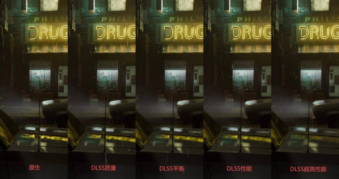 进入《生化危机安魂曲》的画面设置界面,可以看到游戏原生支持NVIDIA DLSS 4多帧生成技术,可关闭和开启2倍、3倍,以及4倍多帧生成,DLSS超分辨率方面,也支持原生、质量、平衡、性能以及超高性能,共五个档位可调。我们对比了不同档位下的画面细节表现,放大后确实能看出一些差距,主要表现在远景模型的清晰度上,但在游戏的越肩视角与RE引擎的画面优化下,这些细小的画面差异几乎不会对玩家的游玩体验造成影响。
