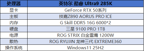 这次我们测试的完整配置如下:CPU选用了英特尔的酷睿 Ultra9 285K,搭配两条16GB的DDR5-6000Mhz内存组成双通道,显卡为英伟达GeForce RTX 50系列,涵盖了从GeForce RTX 5060Ti到GeForce RTX 5090 D v2共五款产品。