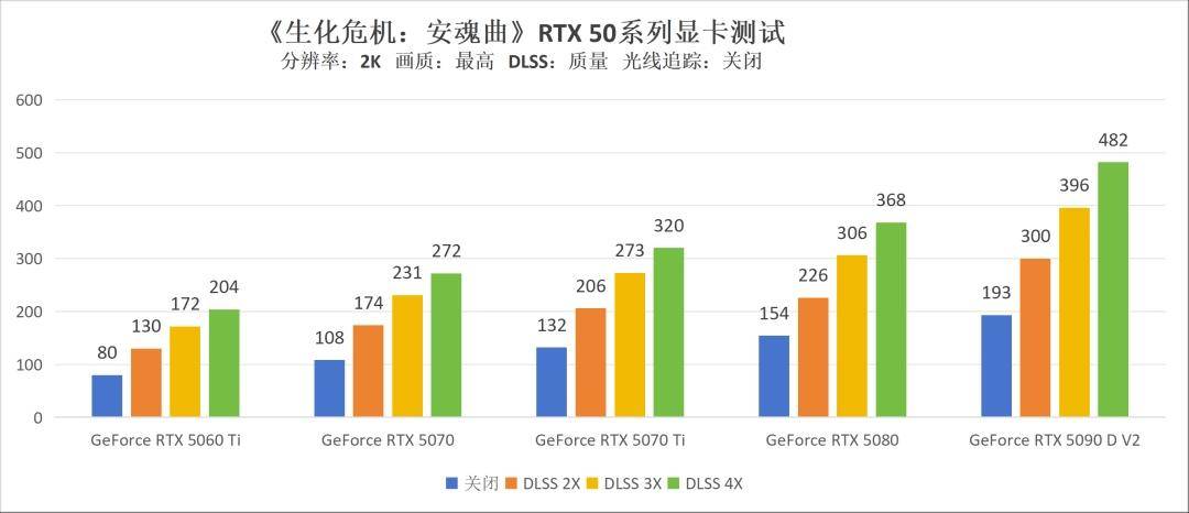 到了2K分辨率,几张显卡的表现依旧很稳定。GeForce RTX 5070在不开帧生成的情况下顽强守住了百帧门槛。开启4倍多帧生成后,最高规格的GeForce RTX 5090 D v2实现了帧数的断档领先,近500帧的成绩超越了第二名GeForce RTX 5080约30%。其他显卡除GeForce RTX 5060 Ti以外,则最高都能跑到240帧以上的成绩,这样的表现肯定是足以喂饱目前市面上主流的2K分辨率显示器的,所以玩家们大可放心体验。