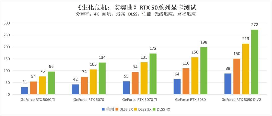最后来到难度最高的4K分辨率,出人意料的是,在不开启光线追踪的情况下,GeForce RTX 5060 Ti依旧能用,更高一档的GeForce RTX 5070也只需开启两倍帧生成,就能降游戏帧数稳定在140以上。而开启4倍多帧生成后,GeForce RTX 5070和GeForce RTX 5070 Ti也都能跑到240帧及以上的成绩,足以应对目前市面上主流4K显示器的屏幕刷新规格。