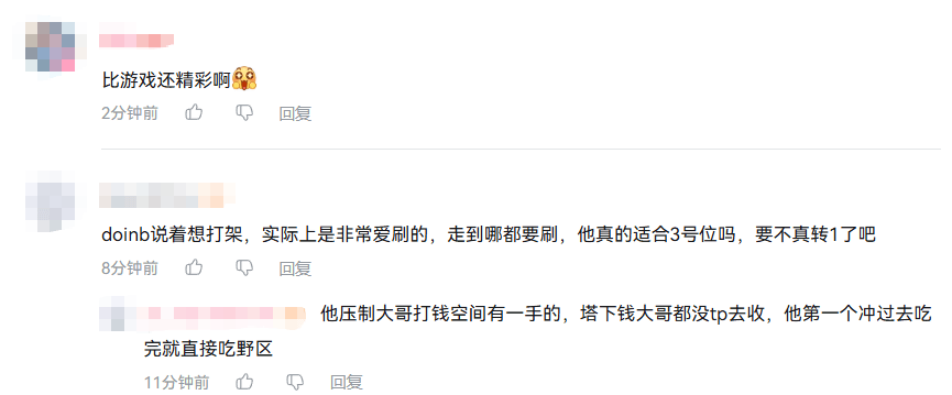 对此,很多看直播的DOTA玩家也看不下去了,觉得Doinb对3号位的理解存在偏执:“Doinb说着想打架,实际上是非常爱刷的,走到哪都要刷,他真的适合3号位吗,要不真转1了吧”,“他压制大哥打钱空间有一手的,塔下钱大哥都没tp去收,他第一个冲过去吃完就直接吃野区”,“永远出大鞋梅肯赤红甲刃甲蹲野区刷野,永远不把兵线往前推,永远打团没蓝,永远漏完兵线钻野区被抓,永远有关键装备差几百要打,这么久了没有进步”……