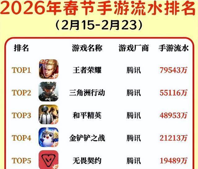 而且,除了王者之外,前五的其他游戏,也都是TX的,这就是游戏帝国的实力,心服口服。说起来也是有意思,反正每次新皮肤,玩家们都会吐槽一下,嘴上虽然这么说,但是身体很诚实,该花费的时候,直接花费,不犹豫,也能理解,现在的皮肤都太帅了,只要你是老玩家,真的会买一下皮肤,特别是给本命英雄买一个,毕竟过年,必须消费一下。