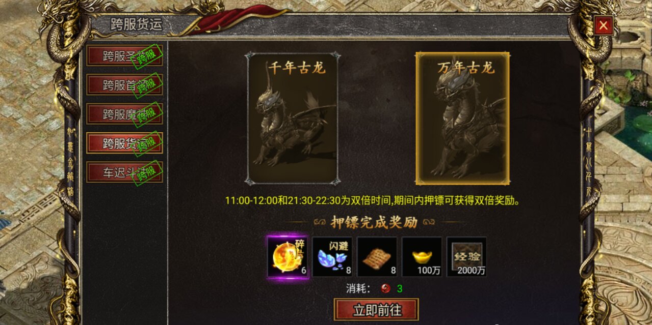 开放时间: 在开服满4天后,即可开启跨服战场,每天有两个时间段可以参加跨服货运活动,分别是11:00到12:00和21:30到22:30。这两个时间段为双倍奖励时间,参与押镖可以获得双倍奖励。