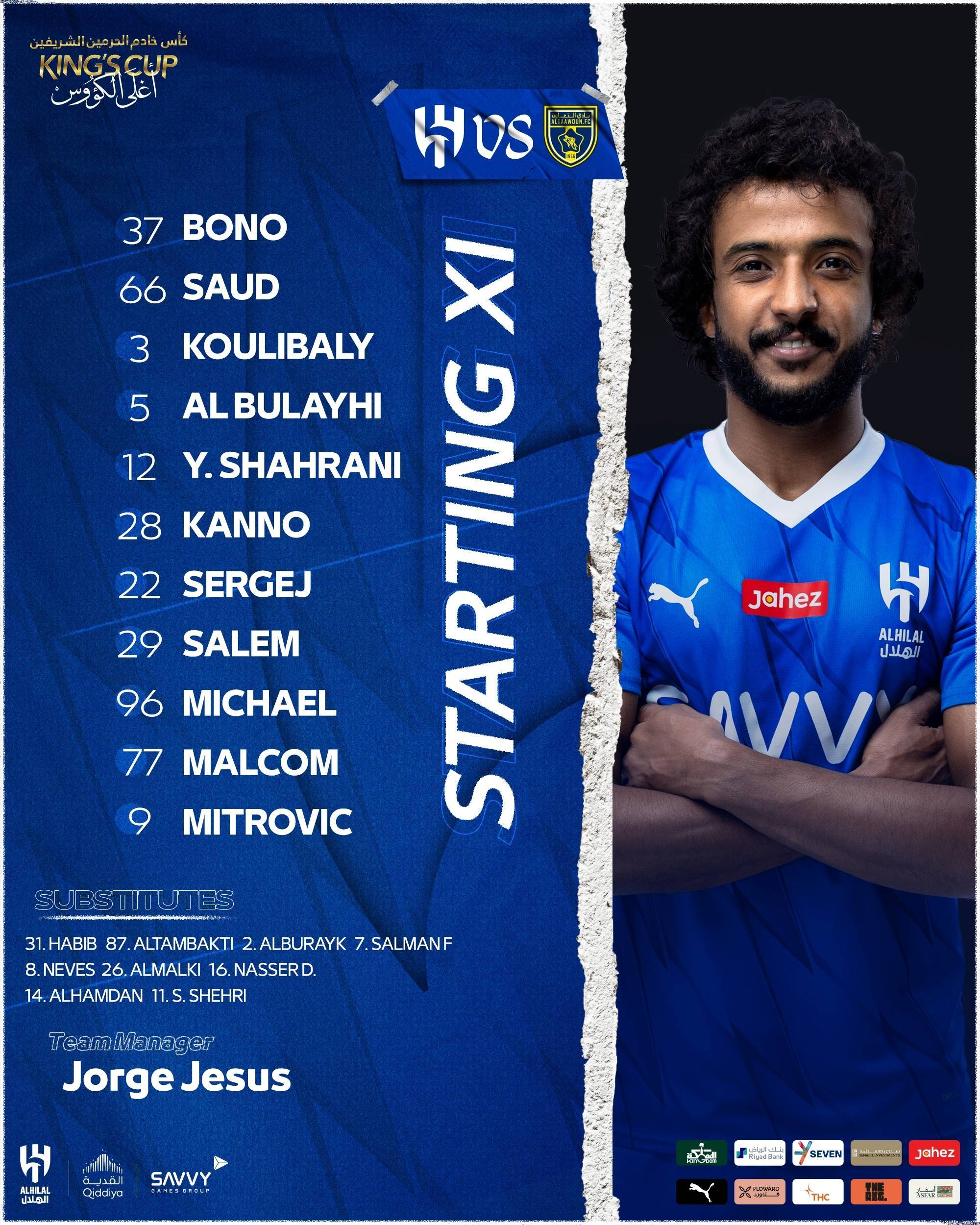 利雅得新月首发:37-布努、66-阿卜杜勒哈米德、3-库利巴利、5-布莱希、12-沙赫拉尼、28-穆罕默德-卡努、22-米林科维奇、29-萨勒姆-多萨里、96-迈克尔、77-马尔科姆、9-米特洛维奇