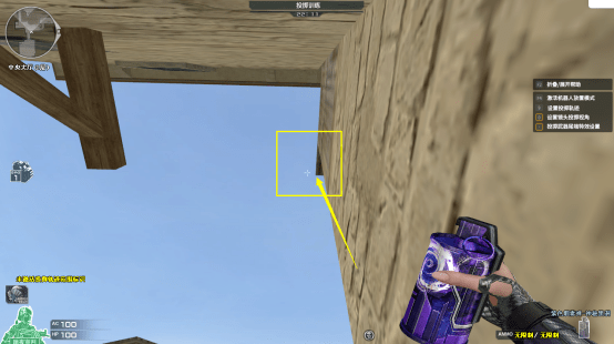 按住S+D抵住右侧墙角,瞄准图中屋檐的位置向左拉开一点然后直接丢出即可。