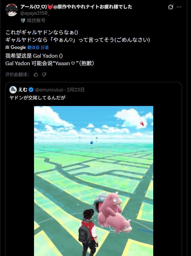 再比如,划时代的手机AR游戏《Pokemon GO》刚推出那会儿,有个玩家P的两只呆呆兽在马路中间“转大人”梗图。放在以前,呆呆兽那个痴傻的表情只会让人觉得好笑,可现在把“辣妹呆呆兽”带入进去的话,虽然违和感更低了,但如果发动鬼脑,这个场景确实很难不让人幻视“今泉家”等一系列传世名作。