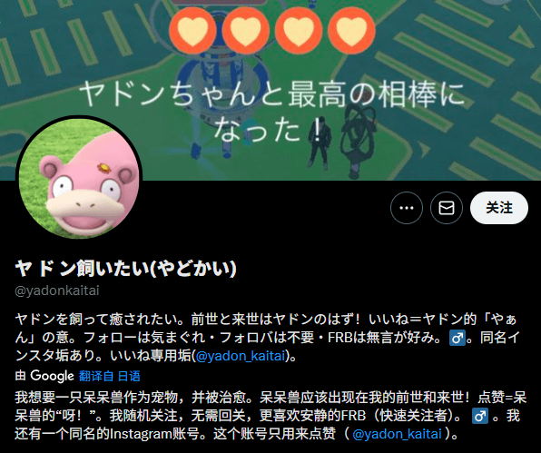 这个脑洞极大的“宝可梦”拟人化创意,最初发源于推特上的一个“呆呆兽单推人”博主“yadonkaitai”。他不仅在自己的账号简介里表示自己特别想养一只呆呆兽(ヤドン),推文里展示的也全是各种呆呆兽主题的周边商品与宣传图,可以说是十分狂热。如果放在“宝可梦”世界观里,他估计能成为一个专门研究呆呆兽,然后给玩家发任务要求捕捉各种品相呆呆兽的“宝可梦博士”。