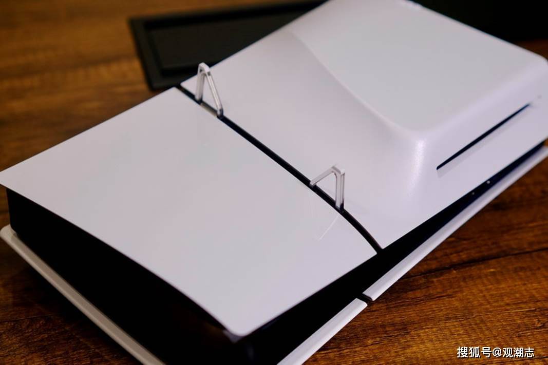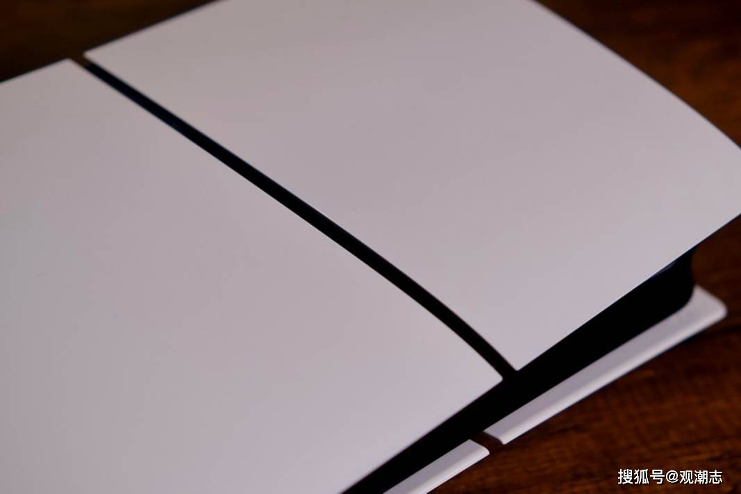 包括覆盖在光驱位置的外壳,PS5轻薄版的外壳从前代的左右两片变成了左右上下各一片,一共四块外壳,这也是PS5轻薄版在外观上的最大特征,侧面看来比前代主机多出了一条分割线。分割线上下的外壳表面材质有区别,上方为光滑反光质感,下方则是与前代主机外壳相同的普通外壳。