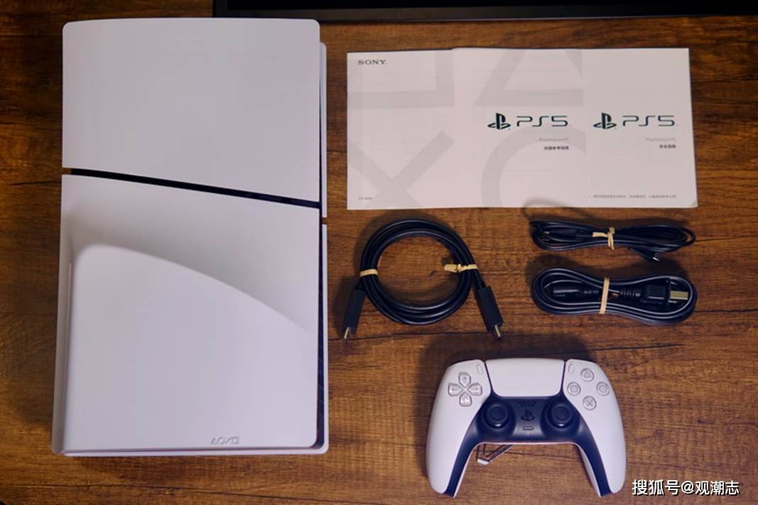 PS5轻薄版包装内含主机本体、电源线、Type-C到Type-C的 USB线、HDMI线、DualSense无线控制器(手柄)、说明书等印刷物以及两个小支架。