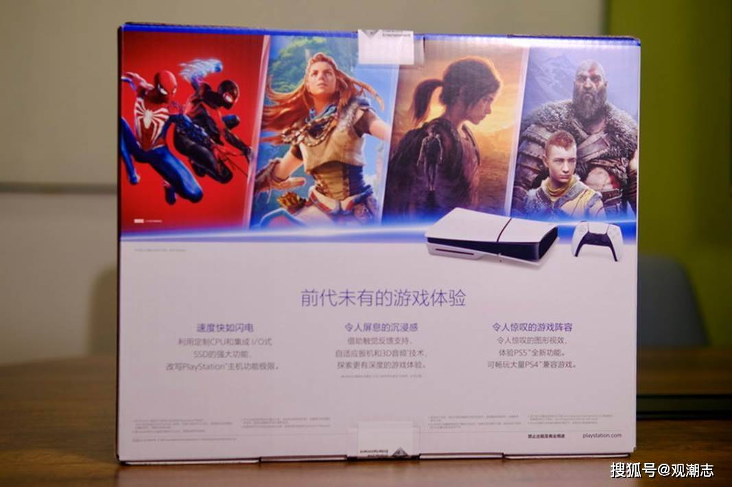 前代PS5包装背面只有主机的图片,毕竟当时首发的PS5游戏并不多,国行首发时曾有一段时间只有《原神》这么一个PS5游戏,而到了这次PS5轻薄版推出时,PS5已经成为了索尼游戏机的主角,发售在PS5上的游戏数不胜数,大作更是独占鳌头,包装盒背面除了本体图片,还印了《蜘蛛侠》系列、《地平线》系列、《最后生还者》系列以及《战神》系列的游戏图片,感受下第一方大作的魅力。
