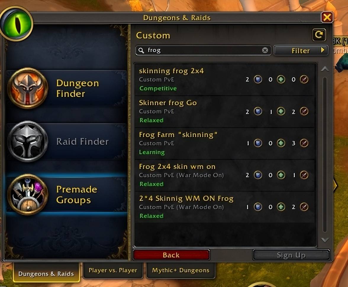 蹲高刷新点通常称作“刷青蛙”,刷青蛙是熊猫人时代的一种古老玩法,最初打的就是青蛙怪,刷次级好运护符。该玩法在熊猫人怀旧服和军团再临混搭中得以复现,玩家们群聚永恒岛疯狂砍蛙,刷金币和青铜。青蛙后来发展为“养殖业”,在多人配合下达到超产效果,主要利用了怪物的“动态刷新”,也就是单位区域如果怪物击杀太快,系统会将其判定为高流量区域而提高其刷新频率。此漏洞在熊猫人重混一度经修复。