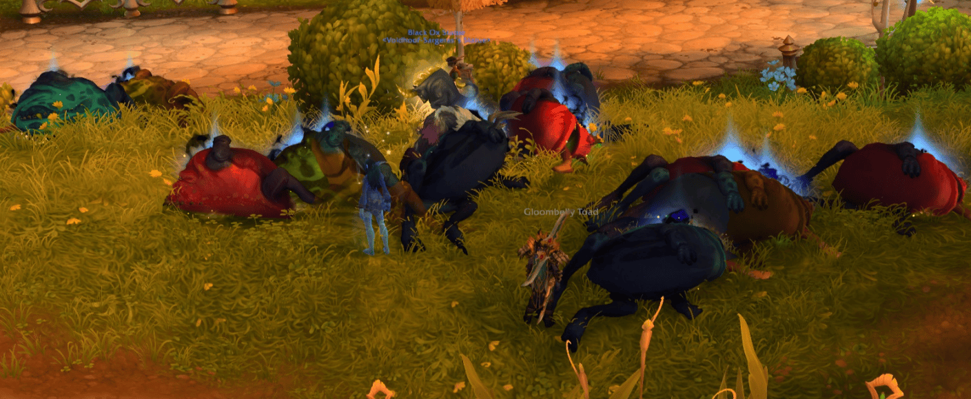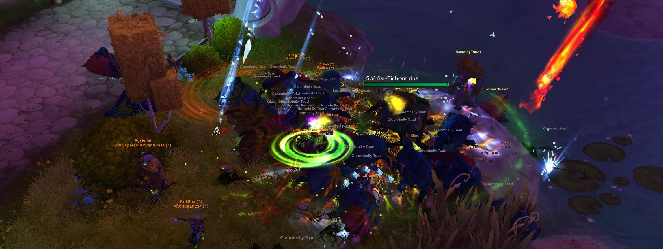 至暗之夜抢先体验也发现了这样的青蛙点,地点是银月城南边的静语池塘(Stillwhisper Pond),刷“幽谷蟾蜍”(Gloombelly Toad),不过这回不掉贵重物品,而是许多专业材料。剥皮之后,可获得虚空淬炼皮革、原始能量微粒、圣光微粒、狂野魔法微粒.。最好是组队进行,因为队伍中可以共享剥皮目标。