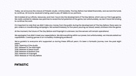 就在《浩劫前夕》灾难性的EA首发之后,其开发商Fntastic宣布倒闭,游戏在Steam也已停止售卖。