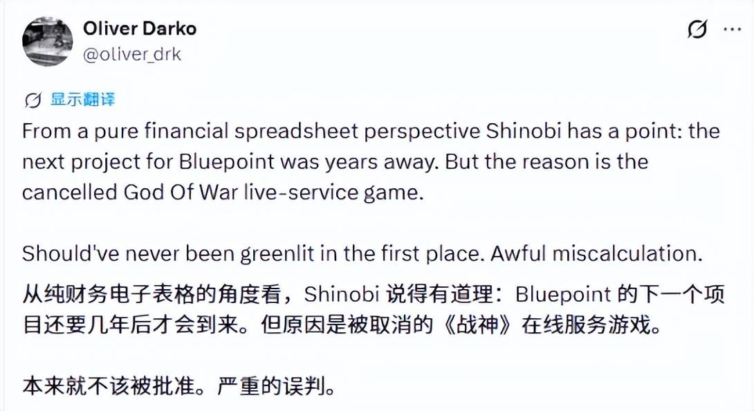 不仅如此,还有博主爆料Bluepoint之所以被关闭,是因为《战神》的在线服务型游戏开发项目取消导致的。